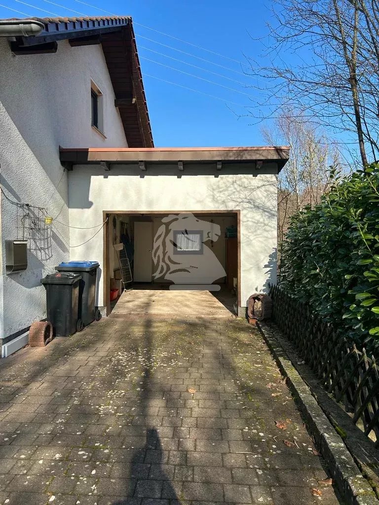 Auf der rechten Seite des Hauses ist eine Garage angebaut.