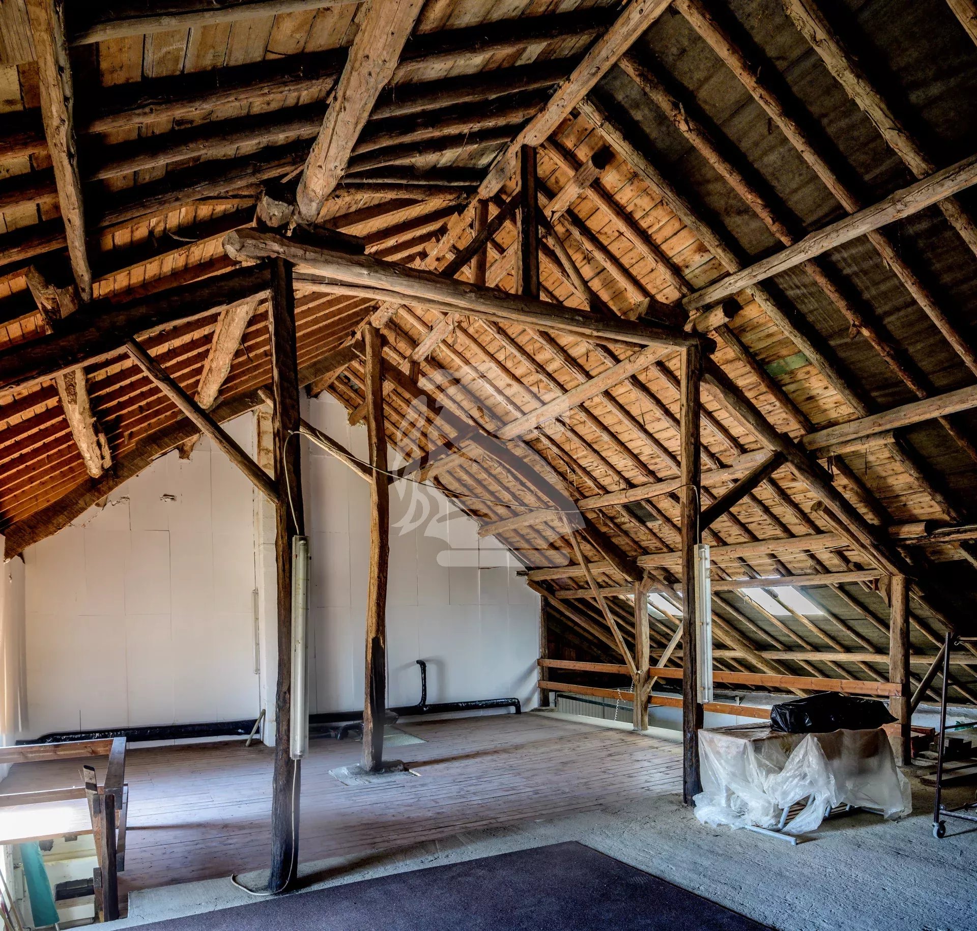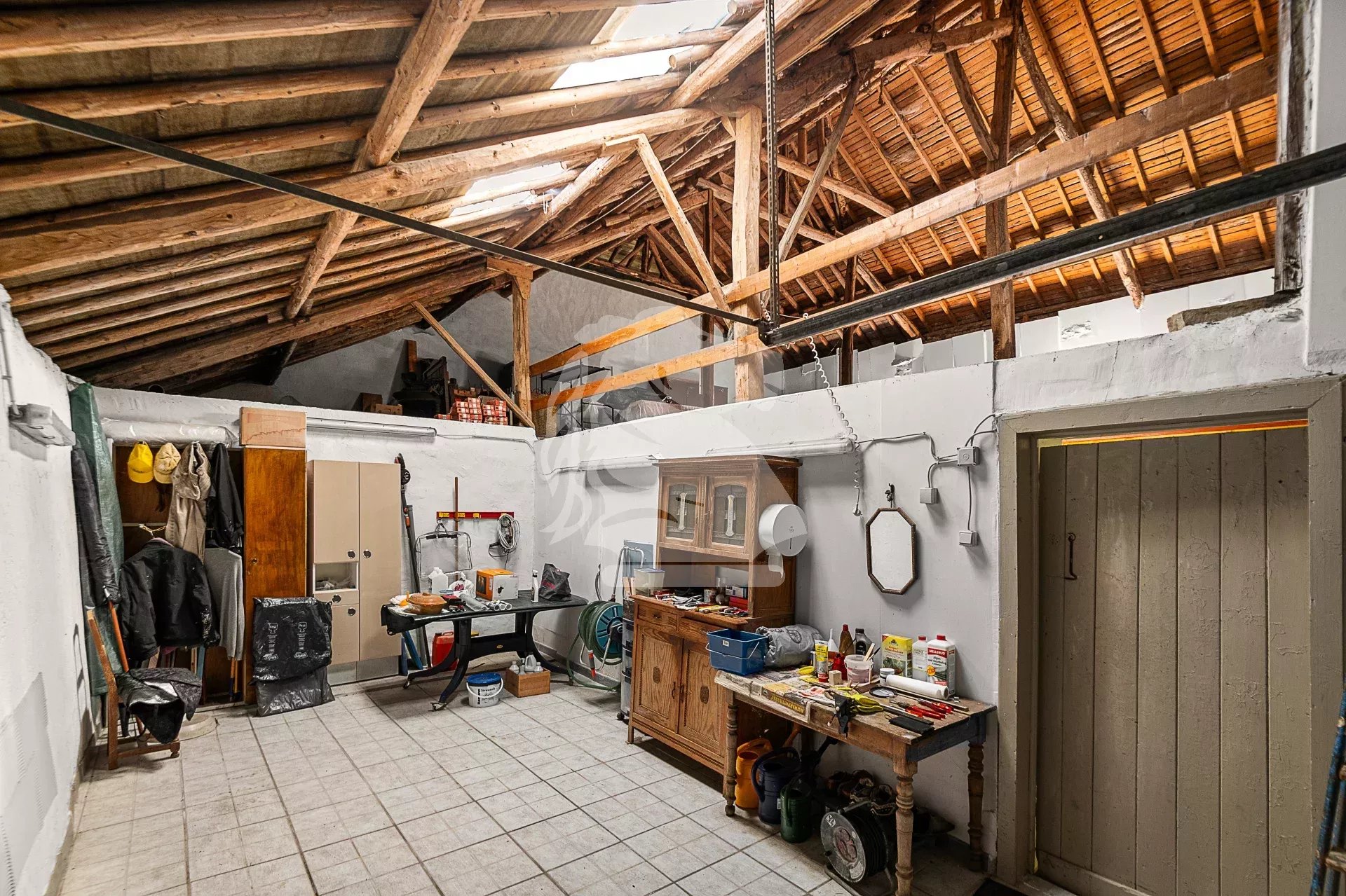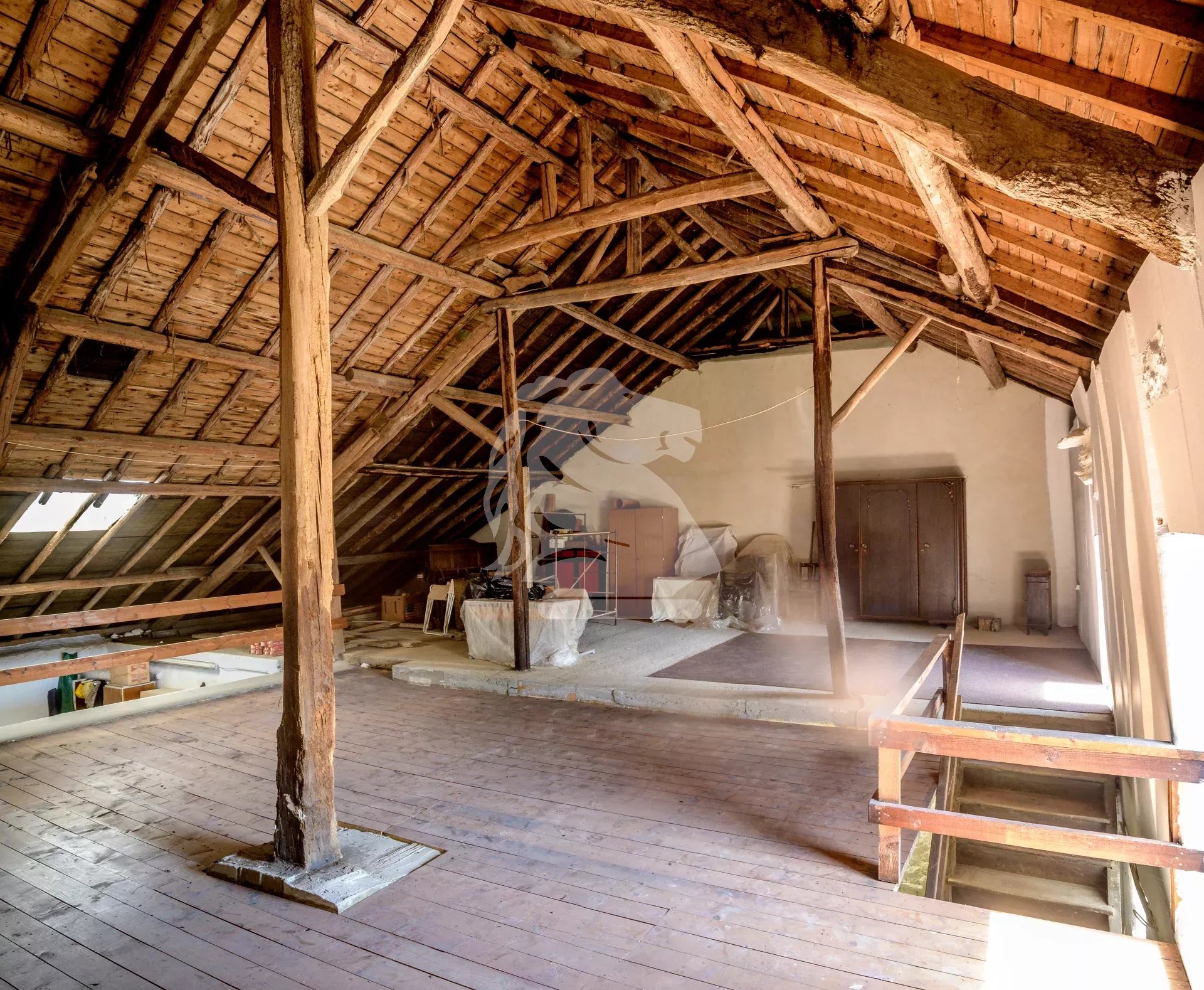 The large attic extends across the entire footprint of the house and can be converted into additional living space or a loft with exposed beams, leaving plenty of room for your renovation ideas. The property also includes a garage, a former workshop, several storage rooms, a 127 m² stable, and a secondary storage area of over 140 m² on the first floor—ideal for craft, workshop, or storage activities.