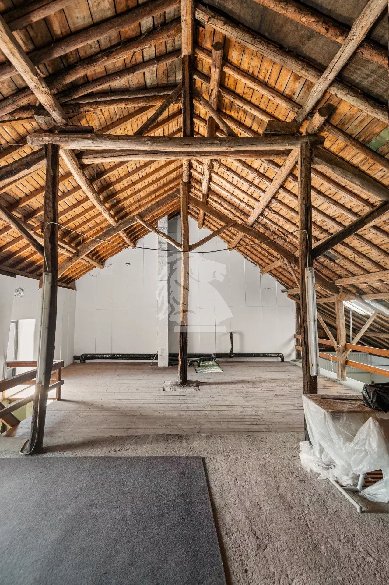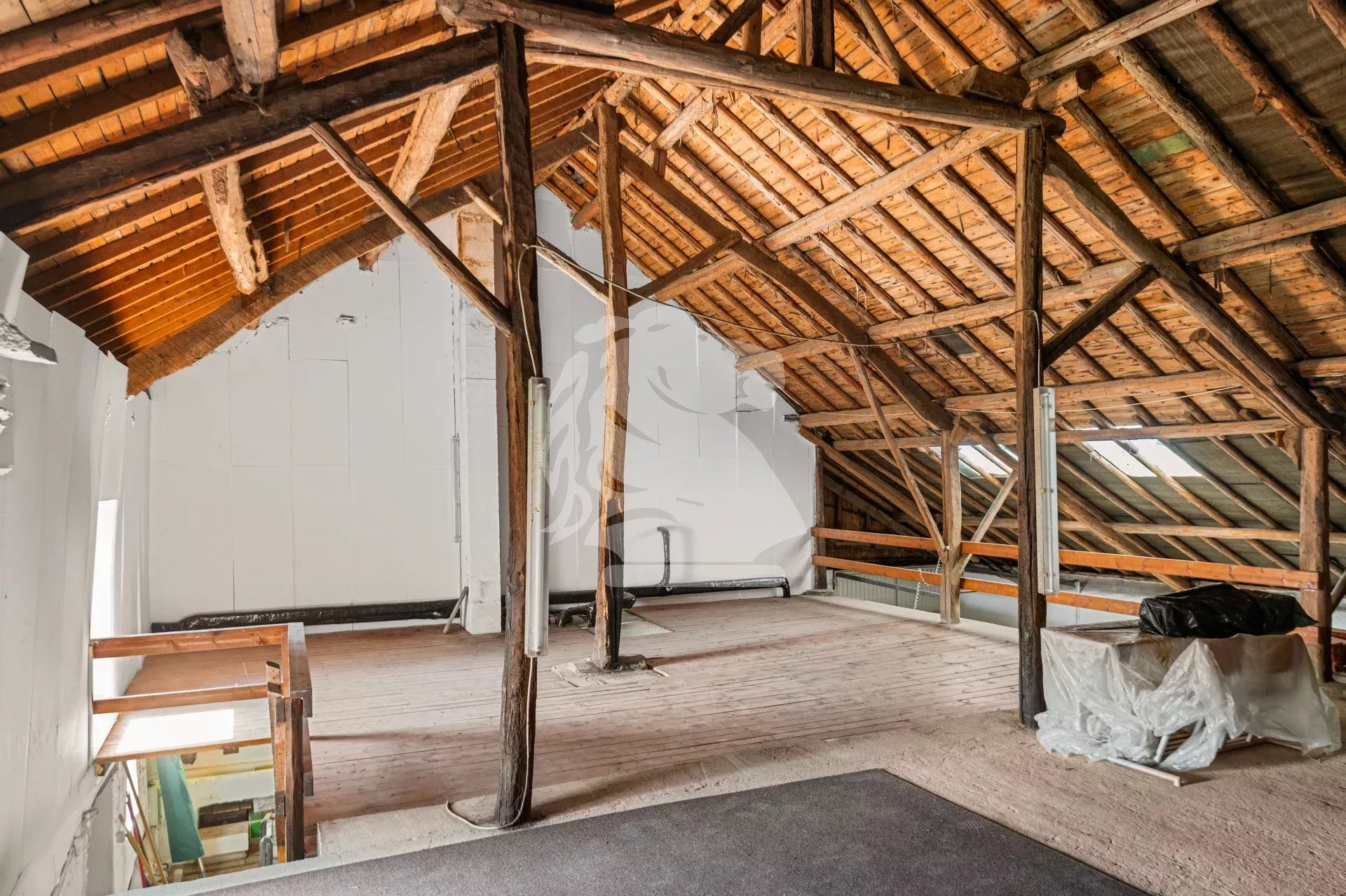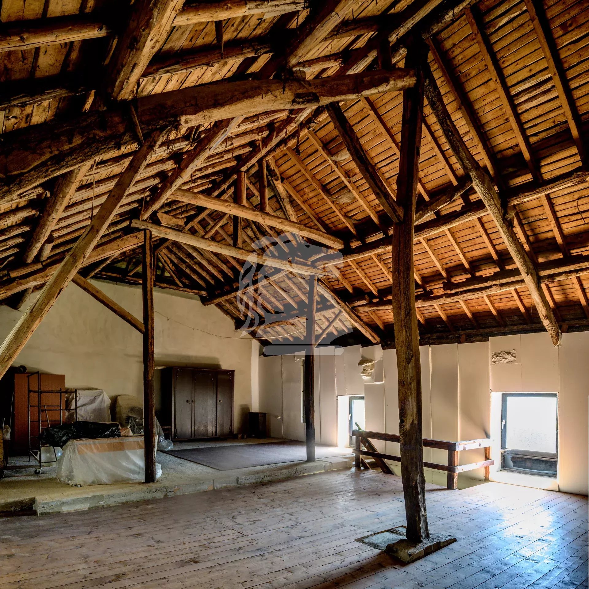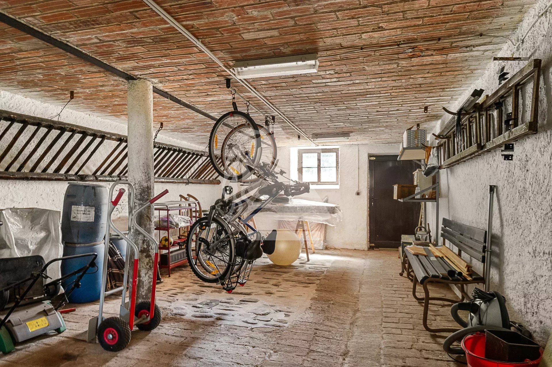 The large attic extends across the entire footprint of the house and can be converted into additional living space or a loft with exposed beams, leaving plenty of room for your renovation ideas. The property also includes a garage, a former workshop, several storage rooms, a 127 m² stable, and a secondary storage area of over 140 m² on the first floor—ideal for craft, workshop, or storage activities.