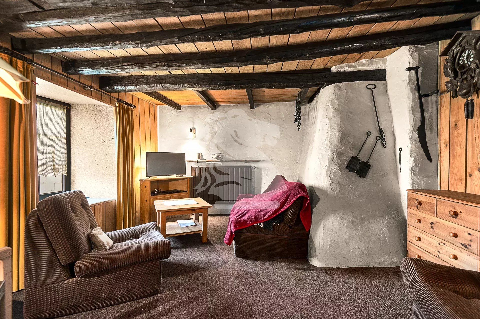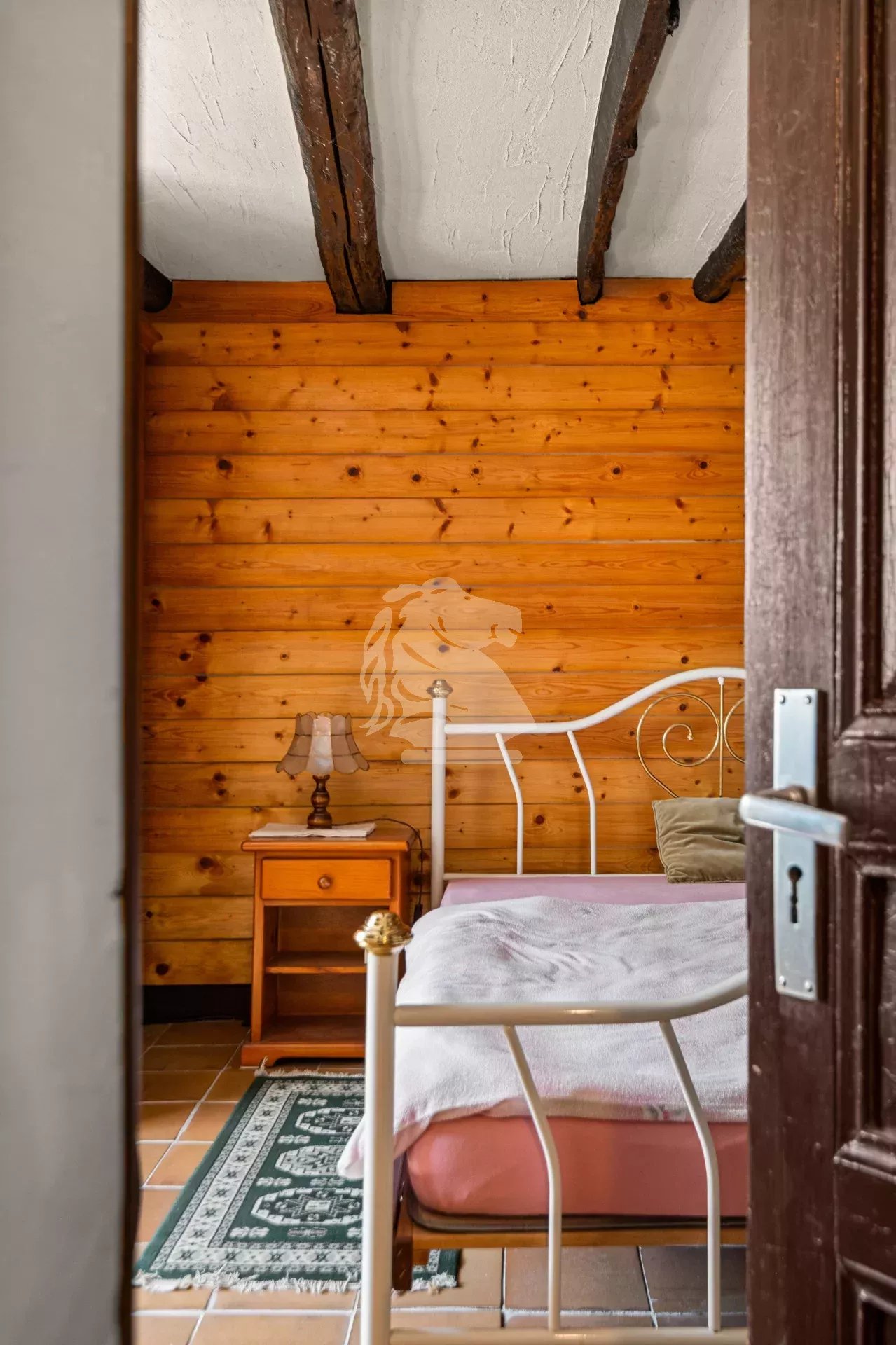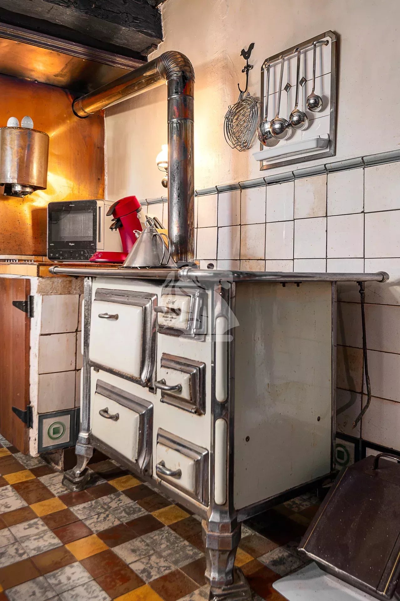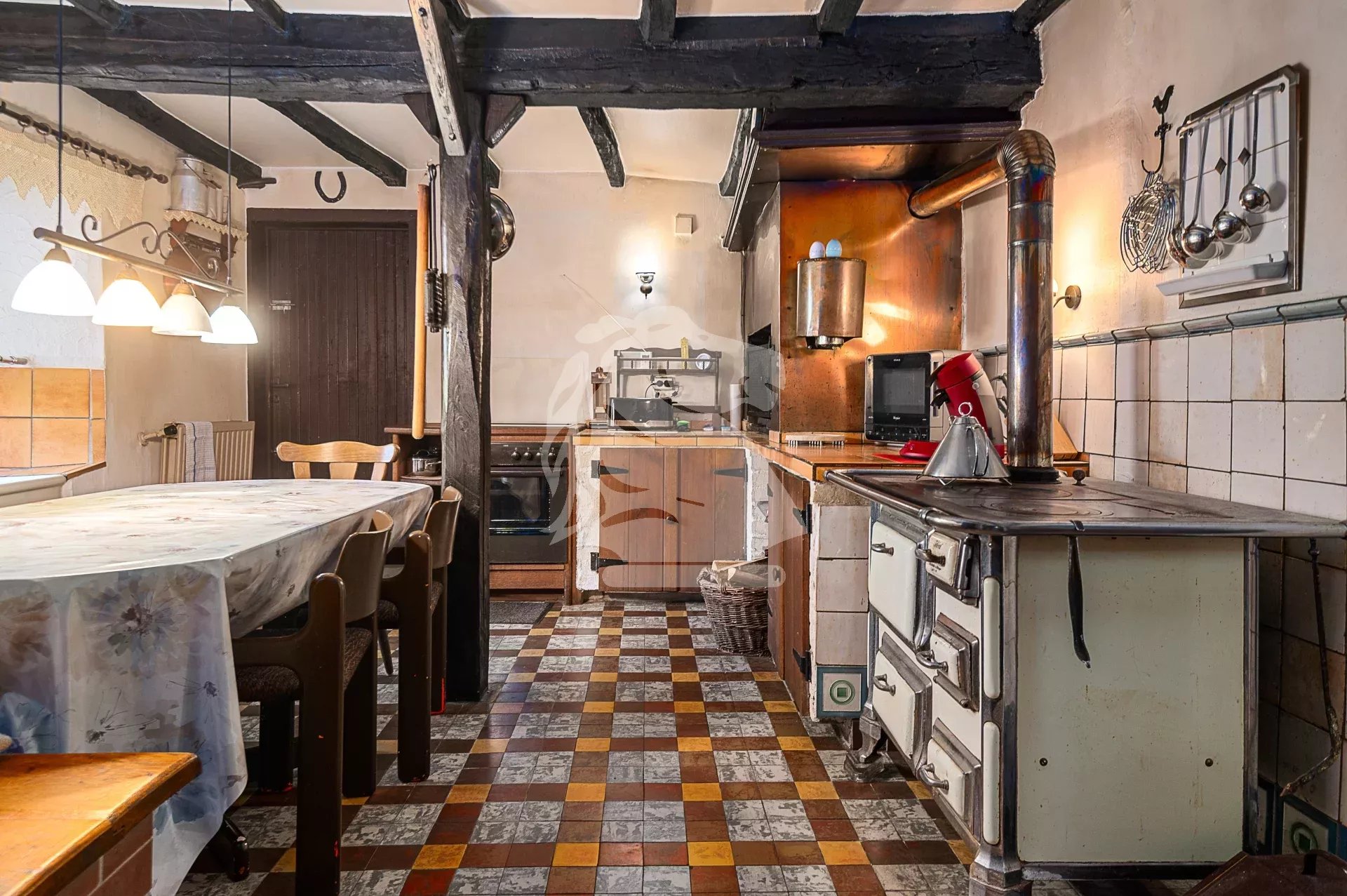 The partially fenced, well-oriented, and tree-lined garden provides a pleasant outdoor space, perfect for relaxation and family life. The overall condition of the property is good, and it has been carefully maintained, preserving original features such as exposed wooden beams, terracotta tile floors, and a traditional stove.