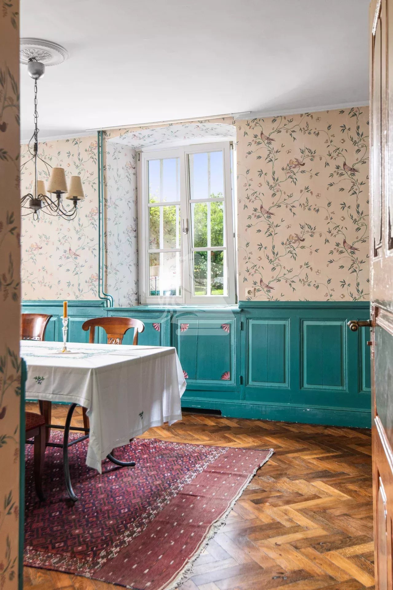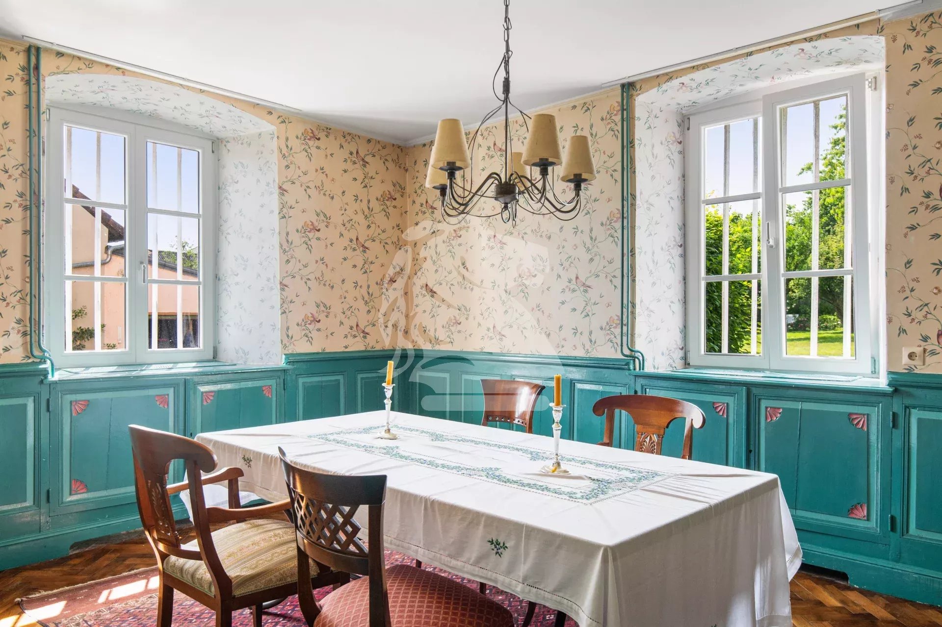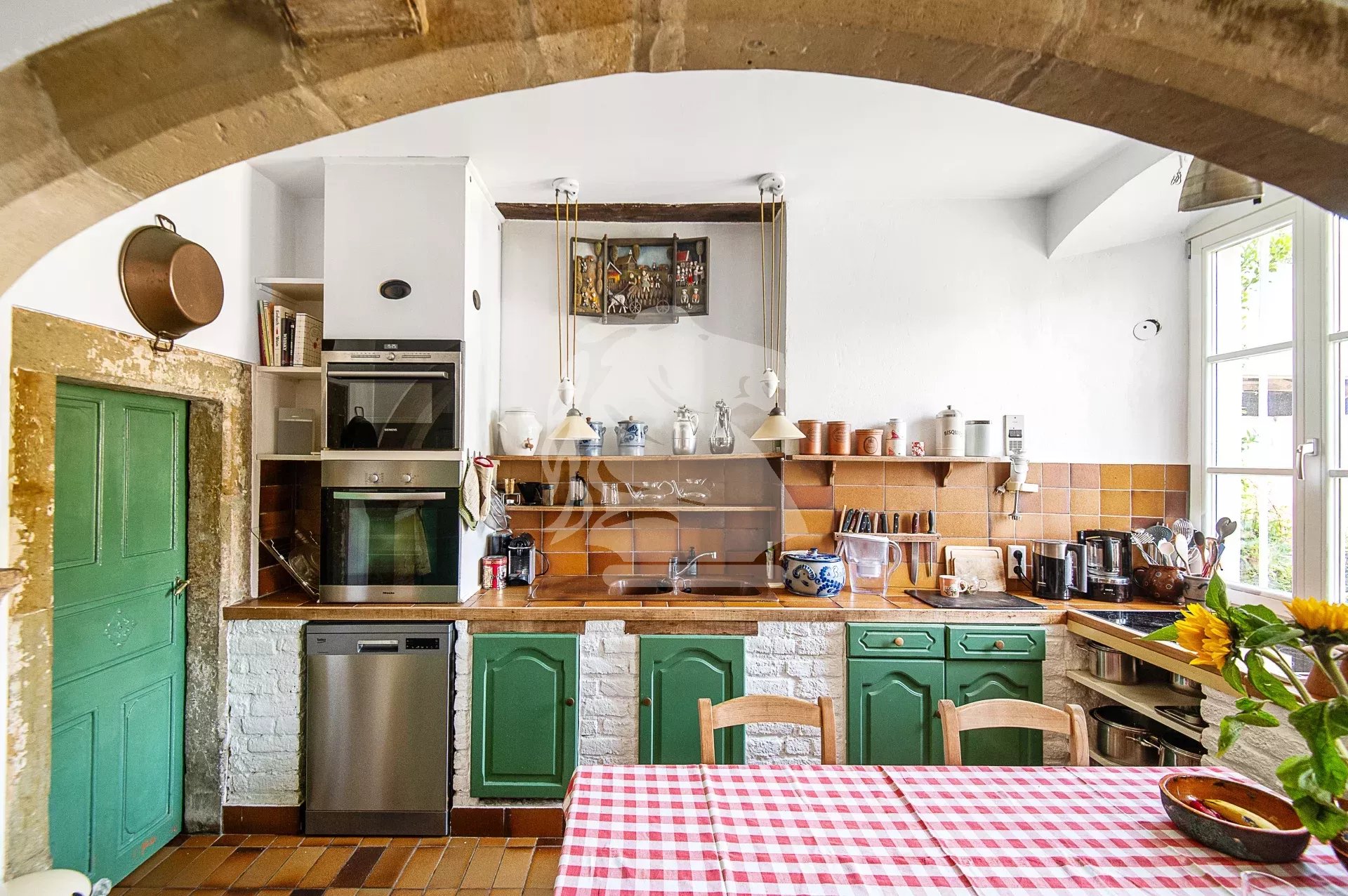 Dès l’entrée, vous serez accueilli par un hall voûté mettant en valeur les éléments d’origine et le cachet de la bâtisse. À droite, un salon confortable vous invite à la détente, tandis qu’à gauche, une élégante salle à manger ornée de boiseries anciennes et baignée de lumière naturelle crée une atmosphère chaleureuse et conviviale. La cuisine, séparée et entièrement équipée, dispose d’un coin repas familial et d’une arrière-cuisine attenante, parfaite pour le rangement.
