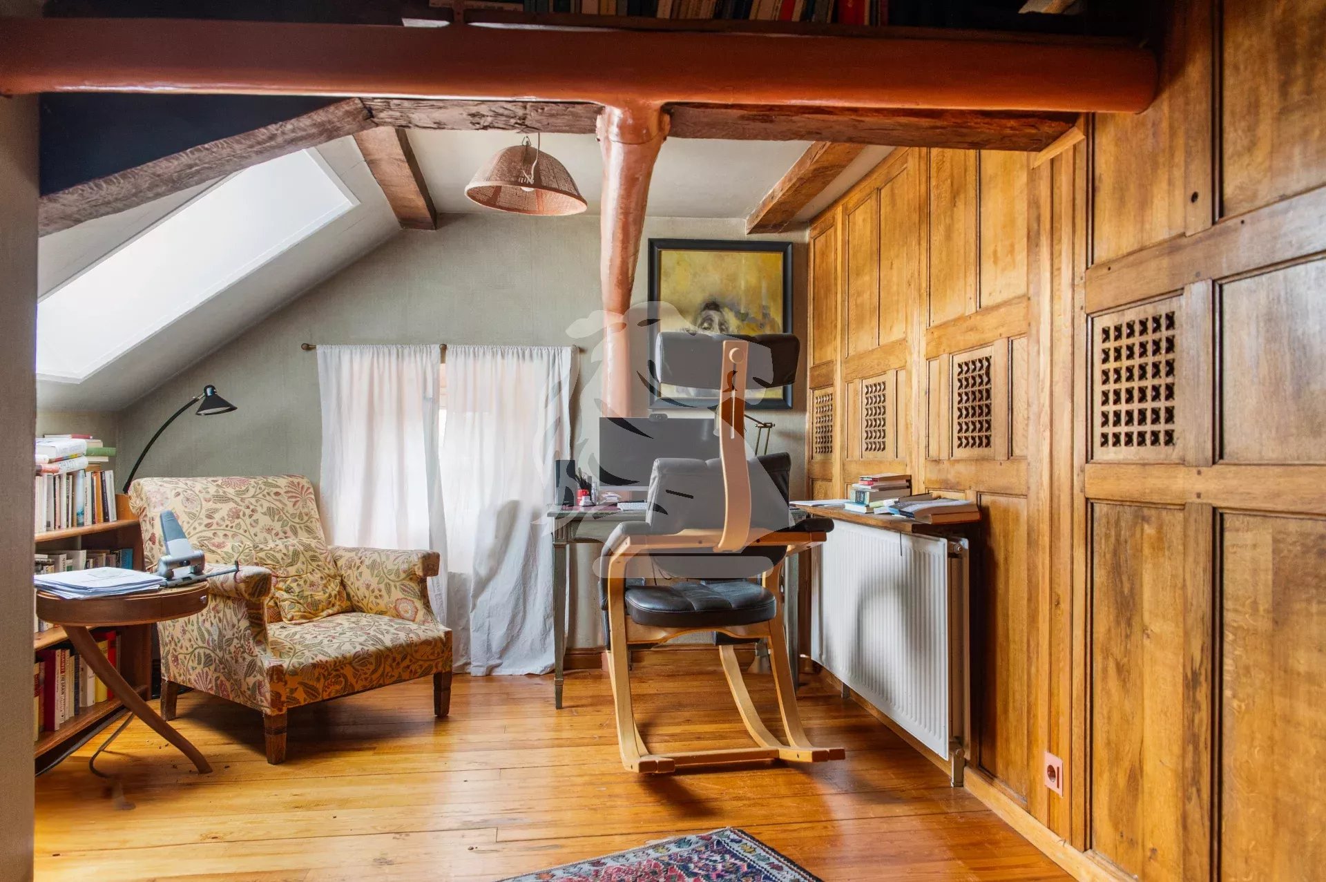 Le deuxième étage, partiellement mansardé, comprend une chambre, une salle de douche avec WC, un espace de rangement, un bureau aménagé dans un esprit cocon avec poutres apparentes, une seconde chambre ainsi qu’une chaufferie avec accès aux combles.