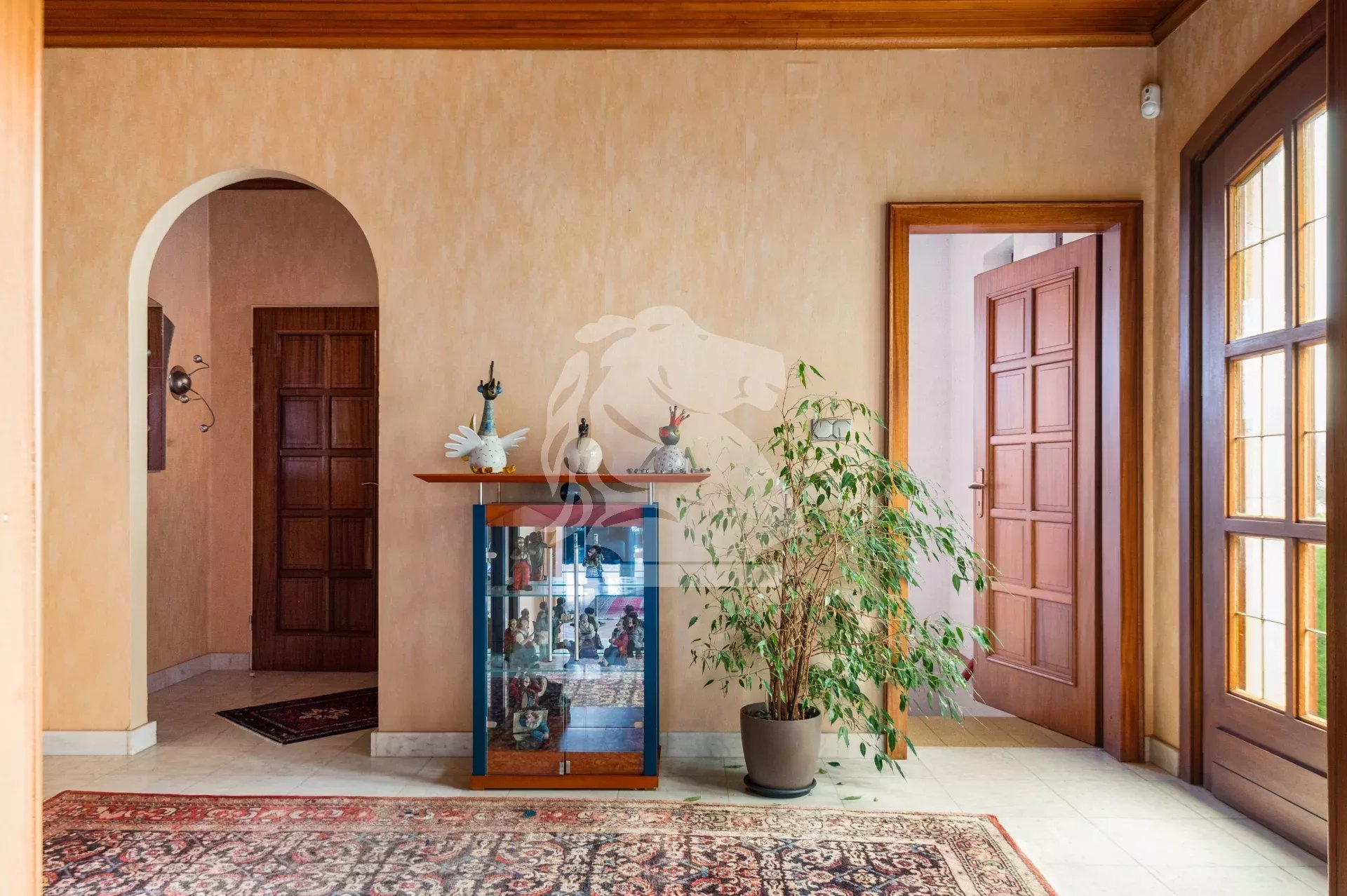 Au rez-de-chaussée, le hall d’entrée dessert harmonieusement les pièces. Sur la gauche, le salon bénéficie d’une cheminée et d’un accès direct à la terrasse et au jardin. La cuisine séparée, fonctionnelle, dispose elle aussi d’un accès direct à la terrasse, idéale pour les repas aux beaux jours.