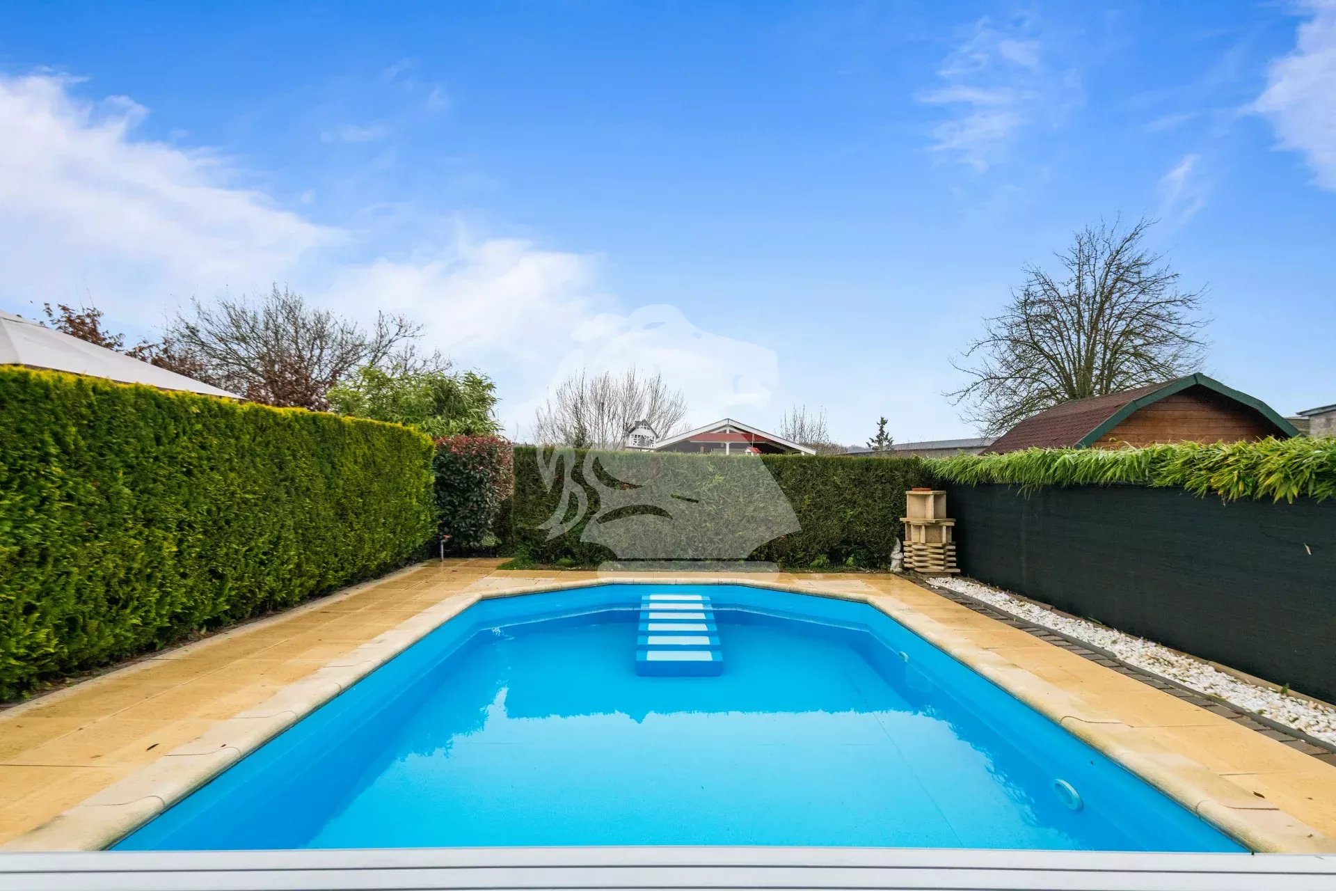 On the first floor, you will discover a kitchen facing the rear of the house, with direct access to a covered terrace. This terrace connects to a heated swimming pool and to the garden, where a garden shed is also located. On the same level, you will find the living area with lounge and dining room, a shower room with WC, and an additional storage room.
